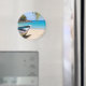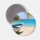 Un imán con una idílica escena tropical en la playa. Agua azul turquesa cristalina y una playa de arena fina de color marrón. Algunas hojas de palmera cuelgan desde arriba. En la playa hay una vieja barca de madera. Un paisaje tranquilo y sereno.