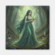 Una hermosa hada con un vestido verde que fluye y un collar hecho de esmeraldas con pétalos de lirio-del-valle en su largo cabello verde esmeralda y sus alas de libélula verde claro e iridiscente sosteniendo un lirio-del-valle en un mágico bosque rodeado de flores azules y amarillas, lirios-del-valle y árboles cubiertos de musgo.