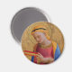 Este imán redondo tiene una imagen vintage de un bello Ángel Cristiano rubio con un halo dorado sosteniendo un Libro Santo sobre un fondo amarillo dorado.