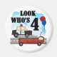 Un crucero de la policía, un motor de bomberos, globos y un texto que dice "Mira quién tiene 4" aparece en el diseño de nuestros héroes cotidianos para el cuarto cumpleaños.