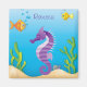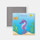 Un bonito imán con una bonita escena submarina con un caballito de mar personalizado morado nadando cerca del fondo del hermoso océano azul con peces y conchas en el fondo. El texto es totalmente personalizable para su propio nombre o ocasión especial. sgb01