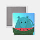Un lindo hipopótamo azul cara listo para comer una gran rebanada jugosa de sandía. Carne rosa con corteza verde oscuro y tres semillas de sandía negra. Un fondo azul suave y sombreado lo acentúa.