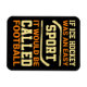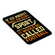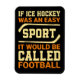 El imán Hockey versus Fútbol muestra texto de amarillo y oro y dos bastones de hockey. ¡Este imán de hockey dice que si el hockey sobre hielo fuera un deporte fácil se llamaría fútbol!