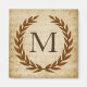 Una delicada corona de laurel está recubierta por un telón de fondo de chapa vintage de estilo romano clásico. Este diseño se personaliza con el monograma "M" en un rico tono de siena.