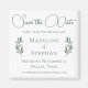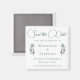 Un elegante y sencillo script de caligrafía verde con dos hojas de eucalipto pintadas con acuarela a ambos lados en la parte inferior para decorar este hermoso y minimalista imán de "Save the Date" de otoño. Un hermoso conjunto para una boda moderna por la noche en un jardín.