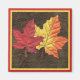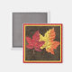 Imán cuadrado con una imagen de colcha de una hoja de arce roja y un naranja y una hoja de arce dorada sobre el marrón. Borde rojo y amarillo. Vea toda la colección del Mimán de Acción de Gracias en la categoría HOME en la sección HOLIDAYS.