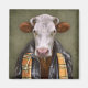 Este diseño presenta un retrato de una vaca con una chaqueta de cuero y una bufanda.