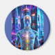 Una forma humana brillante se alza sobre un telón de fondo de rascacielos futuristas, con colores vibrantes y puntos de energía que iluminan varias partes del cuerpo. El paisaje urbano de alta tecnología refleja luces de neón, creando una atmósfera dinámica y energética. Photoshop CS5 de arte digital