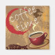 imagen de una taza de café, mancha de anillo de café y granos de café. La prueba dice: Hora del café.