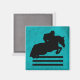 Una silueta de caballo y jinete con un jinete ecuestre en un puente/cazador que salta sobre una valla. Fondo de color turquesa.