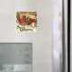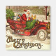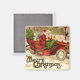 imán vintage cuadrado de refrigerador: santa claus en un viejo auto lleno de juguetes a través de la nieve