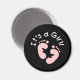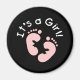 Huellas de bebé rosas sobre un fondo negro y texto blanco que dice "¡Es un Chica!" en los botones de invitación de las niñas.