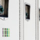 Patrón geométrico lineal, rectangular, rayado de tonos negros, púrpura y verde.