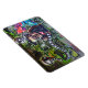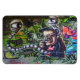 ojos de serpiente mirándolo, un hombre con chaqueta de jeans, camisa roja-blanca y grasa en el pelo, como graffiti estilo 50 rock'n roller en viena austria en donaukanl