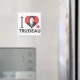 Corazón Trudeau. Amo A Justin Trudeau. Con una hoja de arce canadiense roja. Primer Ministro liberal de Canadá. La cara de Justin hecha como un ilustracion gráfico y terminada en una mirada estridente y angustiada.