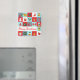 Merry Christmas Cute Retro Navidades de invierno Icons Navidades Magnets presenta el texto "Feliz Navidad" en la moderna tipografía de escritura roja acentuada con íconos Navidades como reno, árbol, caldo, campanilla, muñeco de nieve, regalo, corona, hedor, estrella, caña de caramelo, pan de jengibre, ángel y más. Diseñado por Evco Holidays www.zazzzle.com/store/evcoholidays