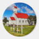 Tradicional iglesia islandesa con tejado rojo y rodeada de césped, algunos árboles y algunas cruces.