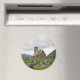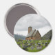 Redondo imán de recuerdo con una iglesia de piedra de madera con lápidas y tumbas en un cementerio al borde de un fiordo entre las montañas de Gaupne, Sogn og Fjordane en Noruega.