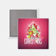Un imán con un diseño gráfico Navidad brillante y festivo. El texto dice Feliz Navidad y Feliz Año Nuevo. Diseñado con un montículo en forma de árbol de regalos con copos de nieve festivos, estrellas, navidades baubles y chispas de aspecto brillante. Las agujas de pino y el ilustracion en forma de árbol también están incluidos en esta imagen de vacaciones. El fondo es de un color rosa rojizo intenso.