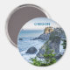 La luz del sol de la mañana tocando una parte accidentada de la costa de Oregón en el punto de vista de Arch Rock Roadside, cerca de Brookings. Varios estanques con sombra se encuentran a la salida de las aguas del océano acuático, rodeados de surf a sus pies y adornados con pinos altos en sus picos soleados. Pequeñas pilas de agua salían de las aguas soleadas en el lejano horizonte nebuloso que gradualmente se fusiona en un cielo azul claro. El primer plano está dominado por verduras y hierbas de color verde oscuro, salpicadas por un conjunto de flores silvestres de iris violeta y amarillo.