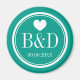 La fiesta nupcial monogramada por personalizados favorece a los imanes. Forma redonda con el corazón y nombre de monograma personalizado letras iniciales. Aqua / Aquamarina azul turquesa / verde marino y blanco. Trato personalizado de agradecimiento a los invitados. Incluye la fecha del matrimonio. También es agradable guardar el recordatorio de fecha.