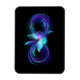 Símbolo infinito con mariposa mágica, morada brillante con alas transparentes, sobre fondo negro. Mariposa brillante.