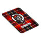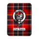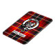 Magnet con insignia de escudo de Scottish Clan Innes y texto sobre fondo tartán