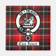 Imán cuadrado con insignia escudo de Scottish Clan Innes y texto sobre fondo tartán