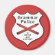 ¡La policía de gramática está aquí! Un divertido imán de cocina para el profesor o estudioso de la gramática, mostrando un gráfico blanco con forma de placa con lápices de colores rojos cruzados y "Policía Gramática para servir y corregir" de tipo negro. El color de fondo es personalizable en el menú Edición.