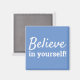 Cita motivacional e inspiradora, "¡Cree en ti mismo!". Un imán que presenta palabras de sabiduría para vivir. El diseño tiene fuente blanca sobre fondo azul que se puede personalizar fácilmente en la sección de herramientas de diseño de Zazzle.