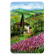 Paisaje toscano, colorido, vibrante, expresiva belleza de la campiña italiana y campos de iris violeta púrpura, hermosa flora de verano en verde brillante, amarillo, marrón, azul, colores blancos, prados, campo de flores, cipreses y olivos, antigua granja rústica bajo el cielo azul y nubes blancas. Pintura acrílica sobre lienzo.