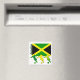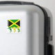 Tres futbolistas juegan frente a la bandera jamaiquina. Nombre del país Jamaica está del lado