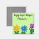 Flores de jardín para dar la bienvenida a la primavera. Amarillo dorado, azul, púrpura. Disfruta de los Placeres Simples de la Vida está escrito en letra negra sobre fondo verde claro. Arte Original de TamiraZDesigns.