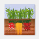 Ilustracion digital de un montón de verduras cultivadas en la buena tierra del jardín. Zanahorias, remolachas y rábanos.
