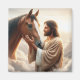 Una escena pacífica que muestra a Jesús en un entorno sereno abrazando un caballo, simbolizando un vínculo con la naturaleza y la espiritualidad.