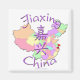 Jiaxing de la provincia de Zhejiang en un colorido mapa de China incluye los símbolos chinos para 'Jiaxing' y su ubicación está marcada en el mapa con un corazón y una bandera. ¡Un regalo único y divertido! Diseñado por Hendrika de RedThreadMaps.com