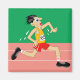 Ilustracion de un atleta corriendo por la pista deportiva con el sudor goteando de él. Imagen disponible en varios regalos y productos.