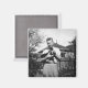 Un joven sosteniendo un gato es una adorable fotografía en este imán. Seguro que te ves bien en esa nevera.