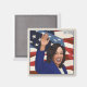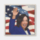 Retrato de la candidata presidencial Kamala Harris con las estrellas y las rayas y el viento detrás de ella.