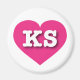Este imán presenta un vibrante corazón rosado caliente que contiene las letras negrita, blanca y alta del KS, la abreviatura oficial de Kansas, el estado de los girasoles.