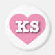 Este imán presenta un vibrante corazón rosado que contiene las letras negrita, blanca y alta del KS, la abreviatura oficial de Kansas, el estado de los girasoles.