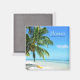 Imán de recuerdo cuadrado con un kayak amarillo bajo una palmera colgante en una playa de arena blanca en la isla tropical de Moorea, cerca de Tahití en el archipiélago del Pacífico Polinesia Francesa, con el texto: "Moorea, Polinesia Francesa".