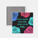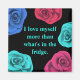 Un imán cuadrado de frigorífico de color negro con rosas pop de color en azul y rosa. El escrito dice "Me amo más que a lo que hay en la nevera". Puede cambiar el color del fondo y del texto si lo desea e incluso la redacción haciendo clic en el botón "personalizar".