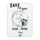 ¡Eleva tu boda con encanto! Nuestra encantadora boda Guarde el imán presenta adorables caricaturas de novia y novio, armonizadas con elegantes tonos azules. Una deliciosa celebración te espera.