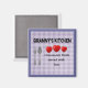 Te encantará este imán de gingham Granny's Kitchen El fondo es de gingham púrpura. El mensaje ha leído corazones y dice "Comidas caseras servidas con amor".