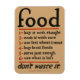 Diseño de Poster de la Segunda Guerra Mundial con colores originales en forma de imán de cocina. Cuenta con 6 reglas para la conservación de alimentos. 1) comprarlo con el pensamiento 2) cocinarlo con cuidado 3) usar menos trigo y carne 4) comprar comida local 5) servir suficiente 6) usar lo que queda