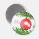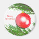 Imán con mi tercera obra de arte de una pelota de Navidades rojos bonitos colgando de un árbol de Navidad. El texto dice "Feliz Navidad".