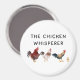 Gracioso diseño de imanes para los amantes del pollo y los granjeros con ilustracion de gallinas a la acuarela y una chica con un texto que dice "el susurrador de pollo"