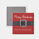 Cinturón de Santa de color negro con hebilla de plata con traje de terciopelo rojo. Feliz Navidad con letra de escritura blanca y un mensaje personal con letra de sans blancos.