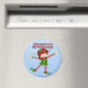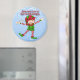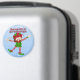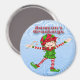 El Greetings Elf Round Magnet de la temporada presenta un fondo azul claro con remolinos y copos de nieve, un elfo feliz de Santa's vestido de rojo y verde, con un colorido bastón de dulces. El estilizado texto de rayas rojas es el saludo de la temporada. ¡Un regalo perfecto para los Navidades! Este diseño se creó utilizando artwork©delightful-doodles.com original (http://delightful-doodles.com/)